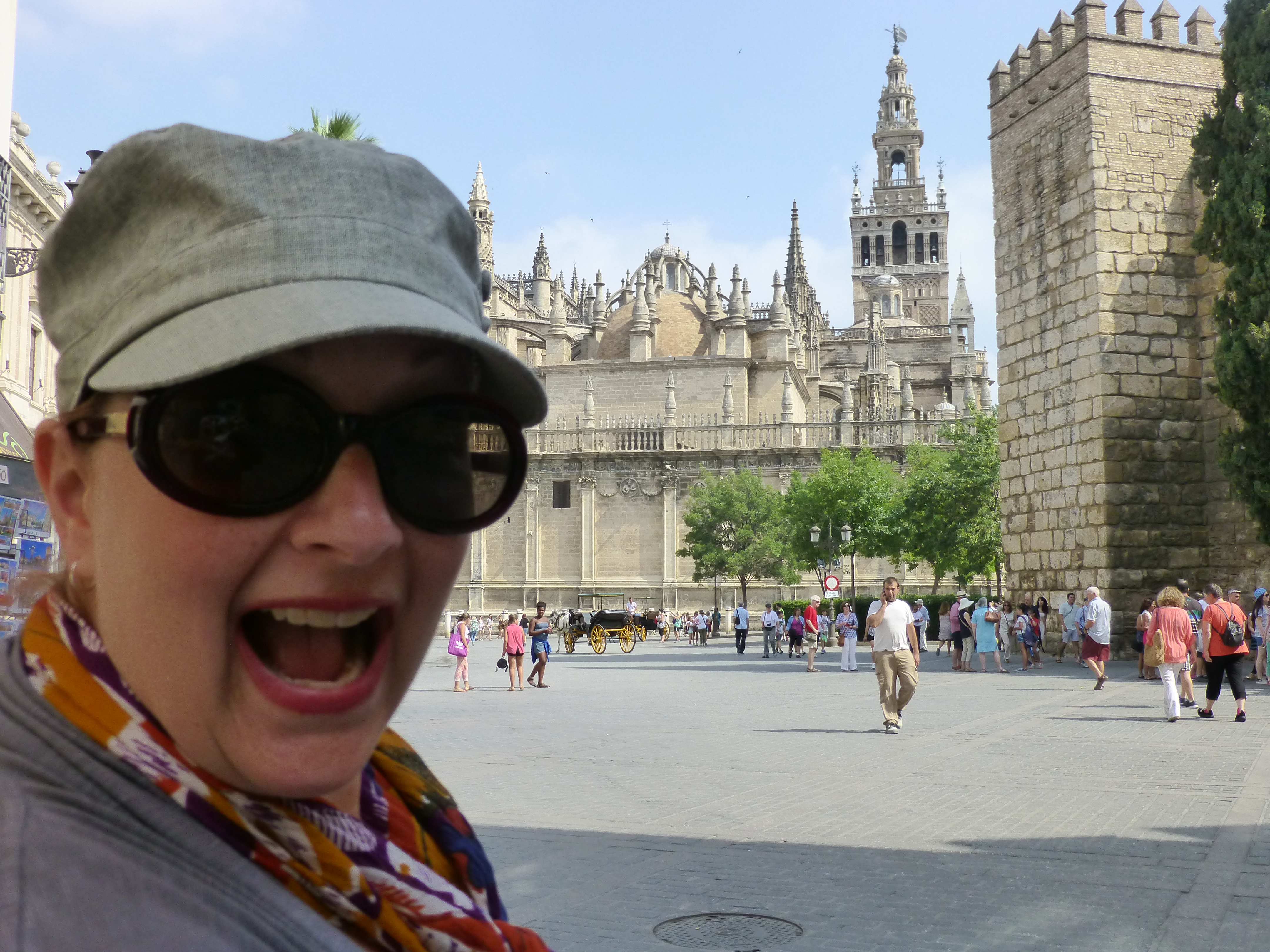 We got up about 5:30 so we could get an early move on driving over to Sevilla (Seville – but they spell it with an “a” so henceforth I will use an “a” unless we are discussing Cadillacs.) They are an hour ahead of us, so we’d lose that once we arrived. It was about 2.5 hours from our apartment in Portimao to the city center. Traffic was nonexistent until we got into Sevilla. It was more of what you would think of driving in Rome or New York, but it wasn’t horrible. Thankfully we have our GPS which has been excellent – well worth the investment if you’re not using public transit.